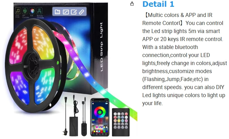 RGB Flexible LED Strip - 5V Dual Control (Bluetooth+Infrared), 24-Key Remote for Girls' Bedroom & Party Decor